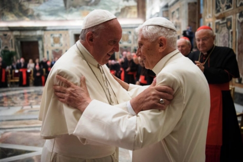 Um prolongado abraço abriu o encontro, marcado pela emotividade e durante o qual Francisco sublinhou que o seu antecessor continua a ajudar a Igreja, “ao viver e testemunhar hoje, de modo tão intenso e luminoso, a única coisa verdadeiramente decisiva, que é ter o olhar e o coração dirigido para Deus”. “Vossa Santidade continua a servir a Igreja e não deixa de contribuir verdadeiramente, com vigor e sabedoria, para o seu crescimento”, realçou Francisco, destacando que Bento XVI o faz “a partir do pequeno Mosteiro Mater Ecclesia, no Vaticano, que desta forma se revela ser bem diferente daqueles lugares esquecidos para onde a atual cultura do descarte costuma arrumar as pessoas de idade quando lhes faltam as forças. É exatamente o contrário, e permita que o diga, com toda a força, o seu sucessor que escolheu chamar-se Francisco”. “Quis a providência que vós, meu querido irmão, permaneçais num lugar – por assim dizer – propriamente franciscano, do qual brota uma tranquilidade, uma paz, uma força, uma confiança, uma maturidade, uma fé, uma dedicação e uma fidelidade que me fazem tão bem e me dão força, a mim e a toda a Igreja”, terminou o Papa Francisco.