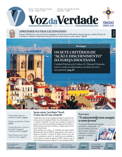 Após o habitual tempo de férias que marca o nosso mês de agosto, regressamos para continuar esta missão de contar a vida da Diocese de Lisboa, em particular, e da Igreja, no geral. Animados por este Espírito que nos impele, também a nós, de concretizar este “sonho missionário de chegar a todos”, desejamos partilhar a alegria da fé vivida em cada lugar, comunidade, grupo ou individuo, pelas histórias que contamos, testemunhamos ou vivemos. Temos procurado ser a Igreja de Lisboa em papel, mas precisamos mais daqueles a quem nos destinamos. Isto é, precisamos da divulgação que pode fazer deste jornal na comunidade paroquial, nas famílias, nos estabelecimentos comerciais, nos lugares de trabalho ou até nas ruas por onde passa. O Jornal VOZ DA VERDADE não é apenas um meio de comunicação social, é um instrumento de pastoral para levar mais longe o Evangelho feito vida, na vida de cada um. É um olhar diferente a realidade! E hoje ele pode entrar até pela porta que a rede cibernética nos abre, com acesso, também, pelo ‘smartphone’ que trazemos no bolso. Pode ser esta, também, e desculpai a ousadia, uma forma de nos comprometermos e responsabilizarmo-nos mais como cristãos, assumindo a identidade do que somos.