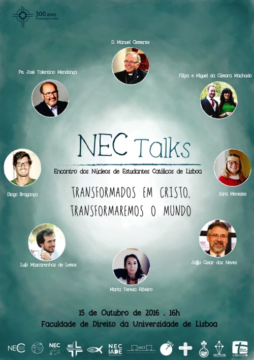 O 1º Encontro dos Núcleos de Estudantes Católicos de Lisboa (NECTalks) vai decorrer no próximo dia 15 de outubro, sábado, às 16h00, na Faculdade de Direito da Universidade de Lisboa, no âmbito na comemoração dos 300 anos da qualificação Patriarcal da Diocese de Lisboa.
