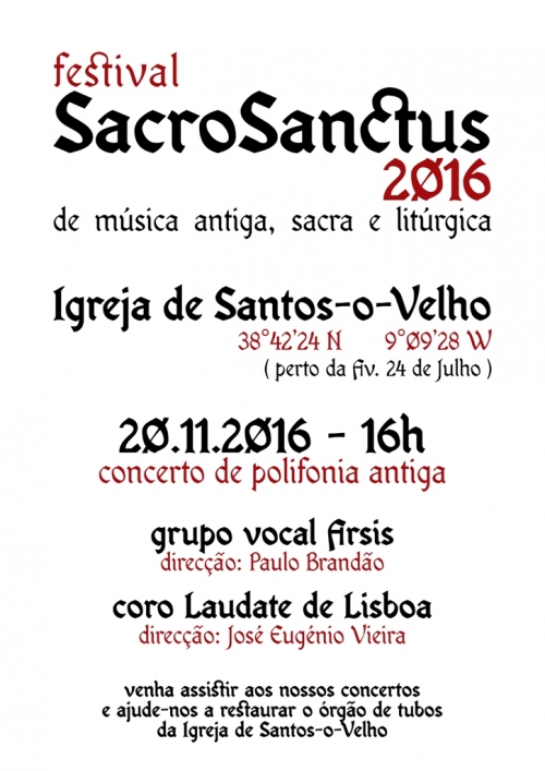 O Festival SacroSanctus, de música antiga, sacra e litúrgica, vai ter mais um concerto de polifonia antiga que decorre no próximo dia 20 de novembro, Domingo, às 16h00, na Igreja de Santos-o-Velho, em Lisboa.