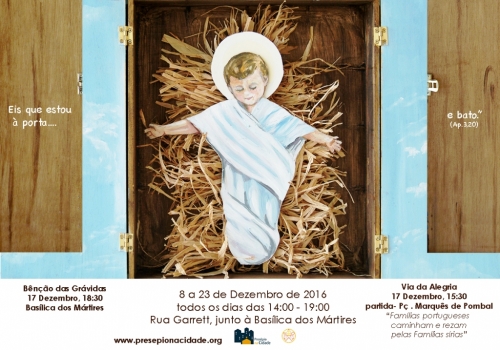 A Via da Alegria, a 17 de dezembro, às 15h30, em que “as famílias portuguesas caminham e rezam pelas famílias sírias”, vai ter início no Marquês de Pombal, seguindo para a Igreja de São Domingos onde às 17h30 há a oração do terço. Às 18h30, na Basílica dos Mártires, tem lugar a Bênção das Grávidas.