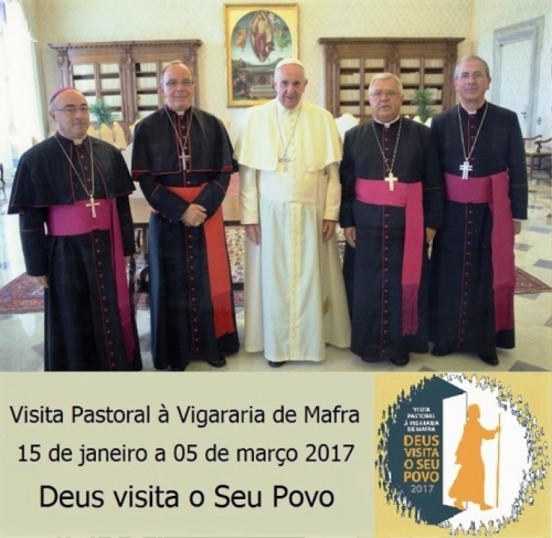 A Visita Pastoral à Vigararia de Mafra tem como lema ‘Deus visita o seu povo’ e vai decorrer, de 15 de janeiro a 5 de março, às 16 paróquias que compõem esta vigararia da zona Oeste do Patriarcado de Lisboa: Alcainça (31 janeiro a 5 fevereiro), Azueira (7 a 12 fevereiro), Carvoeira (15 a 22 janeiro), Cheleiros (24 a 29 janeiro), Encarnação (24 a 29 janeiro), Enxara do Bispo (14 a 19 fevereiro), Ericeira (15 a 22 janeiro), Gradil (7 a 12 fevereiro), Igreja Nova (15 a 22 janeiro), Mafra (28 fevereiro a 5 março), Malveira (24 a 29 janeiro), Milharado (14 a 19 fevereiro), Santo Isidoro (14 a 19 fevereiro), Sobral da Abelheira (31 janeiro a 5 fevereiro), Venda do Pinheiro (31 janeiro a 5 fevereiro) e Vila Franca do Rosário (7 a 12 fevereiro).