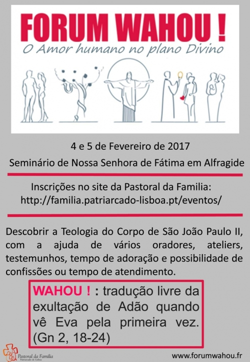 Organizado pela Pastoral da Família do Patriarcado de Lisboa, este encontro propõe um fim-de-semana de reflexão na Teologia do Corpo de João Paulo II – O Amor humano no plano Divino. Dirigido a jovens adultos, pais, avós, solteiros, casais, religiosos, padres, animadores de preparação para o casamento, profissionais de saúde, professores, catequistas, educadores, chefes de escuteiros, entre outros, o Fórum ‘Wahou!’ oferece propostas pedagógicas acessíveis a todos e vai decorrer no Seminário Nossa Senhora de Fátima, em Alfragide, entre as 9h00 do dia 4 de fevereiro, sábado, e as 17h00 de dia 5, Domingo. “Os Fórum ‘Wahou!’ surgiram da necessidade de revitalizar o desejo de conhecer melhor o plano de Deus para o amor humano e resultam de um percurso feito com a colaboração do Instituto da Teologia do Corpo (França) e do Instituto João Paulo II (Roma). Têm como propósito: 1. divulgar a teologia do corpo; 2. propor formas concretas de viver uma verdadeira experiência espiritual transformadora dos corações; 3. encontrar meios para que esta formação possa continuar a ser amplamente transmitida”, refere um comunicado da Pastoral da Família do Patriarcado de Lisboa.