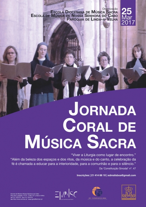 Organizada pela Escola Diocesana de Música Sacra, do Instituto Diocesano da Formação Cristã, e a Escola de Música de Nossa Senhora do Cabo, da Paróquia de Linda-a-Velha, a Jornada Coral de Música Sacra vai decorrer em ritmo sinodal, com a reflexão a incidir no número 47 da Constituição Sinodal de Lisboa. “Teremos as habituais sessões de Técnica Vocal, Leitura Musical e Liturgia. O Canto Polifónico será o culminar da experiência deste dia, que se tem demonstrado de grande agrado e proveito para os participantes”, refere um comunicado da organização.