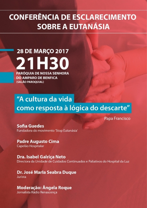 A Paróquia de Nossa Senhora do Amparo de Benfica, em Lisboa, organiza no próximo dia 28 de março, às 21h30, no salão paroquial, uma conferência de esclarecimento sobre a eutanásia, com o tema ‘A cultura da vida como resposta à logica do descarte’.