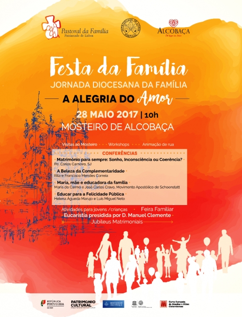 Organizada pelo Sector da Pastoral da Família do Patriarcado de Lisboa, a Festa da Família em Alcobaça tem início às 10h00, com o acolhimento e a oração da manhã (Laudes), na igreja do mosteiro, a que se seguem conferências (‘Matrimónio para sempre: Sonho, Inconsciência ou Coerência?’, ‘ A Beleza da Complementaridade’, ‘Maria, mãe e educadora da família’ e ‘Educar para a Felicidade Pública’), workshops e visitas guiadas ao mosteiro. A manhã terá ainda a Feira Familiar, com jogos e atividades organizadas pelos movimentos de espiritualidade familiar. Após o almoço partilhado, no mercado municipal, às 15h00 vai decorrer uma breve catequese sobre as bodas matrimoniais e, às 16h00, a Eucaristia com celebração das bodas matrimoniais para os casais que festejam 10, 25, 50 ou mais anos de casados em 2017.