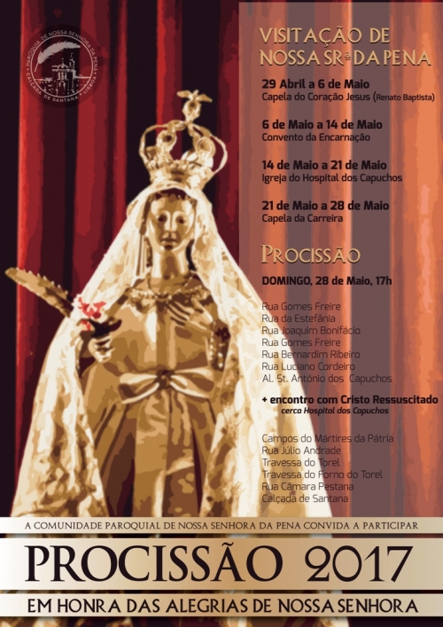 A Paróquia da Pena, na Calçada de Santana, em Lisboa, organiza neste Domingo, 28 de maio, a partir das 17h00, a procissão em honra das alegrias de Nossa Senhora da Pena, com início na Capela da Carreira, na Rua Gomes Freire.