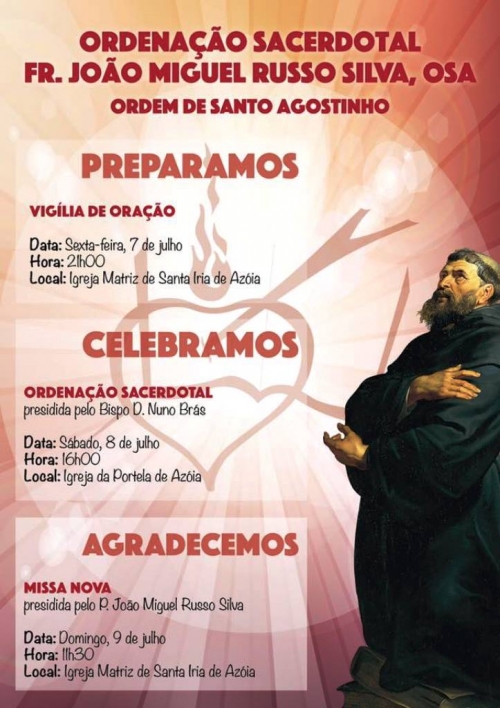 A Igreja da Portela de Azóia, na Paróquia de Santa Iria de Azóia, vai acolher, a 8 de julho, sábado, às 16h00, a ordenação presbiteral de frei João Miguel Russo Silva, da Ordem de Santo Agostinho (OSA).