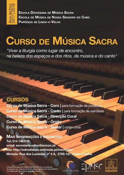 A Escola Diocesana de Música Sacra (EDMS) divulgou os quatro cursos de música sacra disponíveis para o ano letivo 2017-2018: Curso de Música Sacra - variante Coro (Coralistas), Curso de Música Sacra - variante Direção (Diretores / Maestros), Curso de Música Sacra - variante Canto (Salmistas / Cantores solistas) e Curso de Música Sacra - variante Órgão (Organistas).