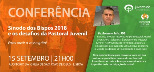 ‘Sínodo dos Bispos 2018 e os desafios da Pastoral Juvenil’ é o tema da conferência, organizada pelo Serviço da Juventude do Patriarcado de Lisboa e a Pastoral Juvenil Salesiana, que decorre no próximo dia 15 de setembro, sexta-feira, às 21h00, no auditório da Igreja de São João de Deus, em Lisboa. A iniciativa, que se destina a “sacerdotes, animadores de grupos e Movimentos e a responsáveis pela área da Pastoral Juvenil”, conta com a presença do padre Rossano Sala, “um dos maiores especialistas mundiais em Pastoral Juvenil e membro da equipa de trabalho do Vaticano responsável pela coordenação do próximo Sínodo dos Bispos dedicado aos jovens”, assinala uma nota do Serviço da Juventude. A participação é gratuita e não é necessária inscrição.