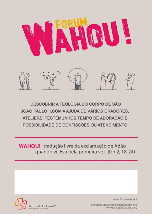 A Pastoral da Família do Patriarcado de Lisboa organiza a segunda edição do Fórum ‘Wahou’, dedicado à Teologia do Corpo, que vai decorrer nos dias 7 e 8 de outubro, no Centro de Espiritualidade, no Turcifal. “O Fórum ‘Wahou’ surgiu da necessidade de revitalizar o desejo de conhecer melhor o plano de Deus para o amor humano, junto daqueles que achavam que já nada mais havia para aprender. Trata-se de um fim-de-semana de imersão total na Antropologia de João Paulo II, com comunicações de conhecidos oradores e ateliers práticos”, refere um comunicado.