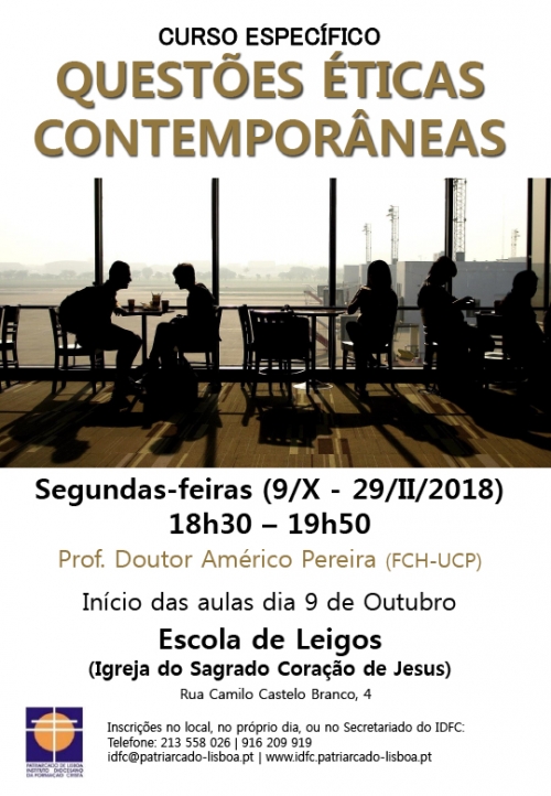 A temática das questões éticas vai ser abordada no novo curso específico da Escola de Leigos do Instituto Diocesano da Formação Cristã (IDFC). A formação vai decorrer a partir do dia 9 de outubro, na igreja do Sagrado Coração de Jesus, em Lisboa, e vai terminar em fevereiro de 2018. Do programa de 15 aulas fazem parte disciplinas como “O Bem-comum”, “A Guerra”, “Ecologia - Ambiente e Pessoa”, “Pena de Morte”, “Aborto”, “Eutanásia”, entre outros.