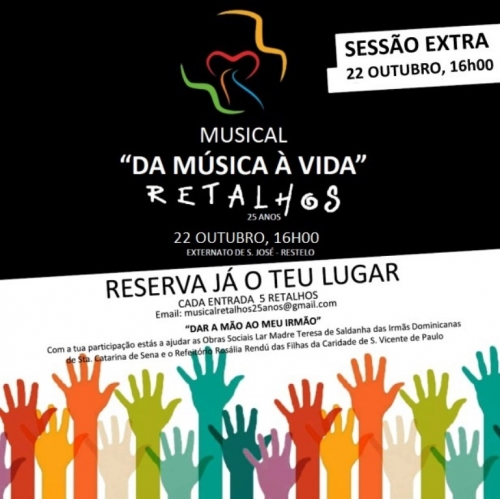 Nascido em 1992, o grupo ‘Retalhos’ celebra 25 anos com o musical ‘Da Música à Vida’, no auditório do Colégio de São José (Restelo). “25 anos depois, queremos recordar histórias, músicas e sobretudo as mensagens que nos animam e que tentamos transmitir. ‘Da Música à Vida’ foi sempre o nosso lema! E é este o título do musical que propomos, no dia 21, às 21h30 (já esgotada), e 22 de outubro, às 16h00, para lembrar músicas de outros tempos”, frisa um comunicado.
