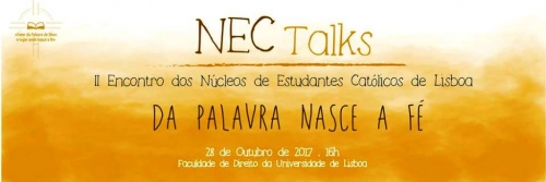 ‘Da Palavra nasce a Fé’ é a frase que vai servir de inspiração ao II Encontro dos Núcleos de Estudantes Católicos de Lisboa (NECTalks), que tem lugar no próximo dia 28 de outubro, na Faculdade de Direito da Universidade de Lisboa, a partir das 16 horas.