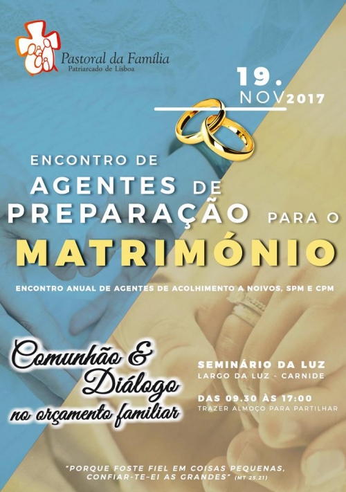 A Pastoral Familiar do Patriarcado de Lisboa promove, a 19 de novembro, Domingo, no Seminário da Luz, em Carnide, Lisboa, o habitual Encontro Anual de Agentes de Preparação para o Matrimónio, com o tema ‘Comunhão e diálogo no orçamento familiar’.