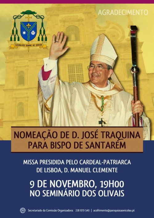 D. José Augusto Traquina Maria, de 63 anos, foi nomeado Bispo de Santarém pelo Papa Francisco, no passado dia 7 de outubro. A entrada solene de D. José Traquina na nova diocese vai decorrer no dia 26 de novembro, Domingo, pelas 16h00, na Igreja de Santa Clara, em Santarém.