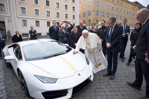 Ainda na quarta-feira, a marca italiana Lamborghini ofereceu ao Papa Francisco uma edição única do modelo Huracan, de cor branca, com listas douradas. O carro desportivo de luxo, já autografado, vai ser leiloado pela Sotheby’s e o lucro vai ser depois entregue ao Papa que já decidiu entregar o dinheiro a instituições que trabalham em diferentes projetos: o regresso dos cristãos à planície de Ninive, no Iraque (Fundação Ajuda à Igreja que Sofre); ajudar as mulheres a sair do tráfico e da prostituição (projeto Casa Papa Francesco) e duas associações italianas presentes em África (Gicam e Amici del Centrafrica).