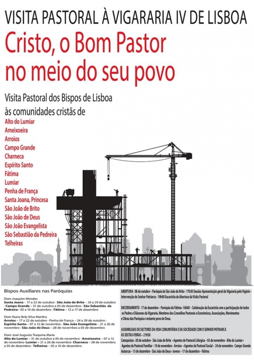 Com o tema ‘Com Cristo Bom Pastor, ao encontro de todos’, a Visita Pastoral à Vigararia Lisboa IV teve início no passado dia 8 de outubro e percorreu, ao longo de mais de dois meses, todas as 15 paróquias que compõem a vigararia (Alto do Lumiar, Ameixoeira, Arroios, Campo Grande, Charneca, Fátima, Espírito Santo, Lumiar, Penha de França, Santa Joana Princesa, São João de Brito, São João de Deus, São João Evangelista, São Sebastião da Pedreira e Telheiras).