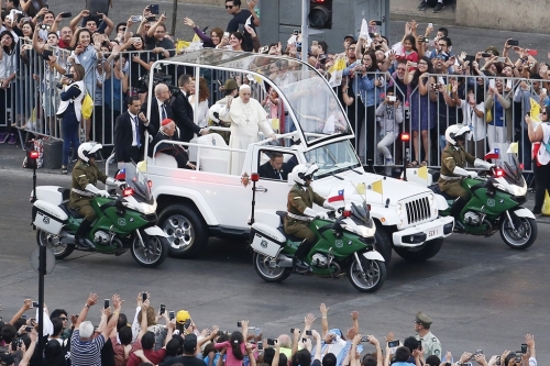 4. O Papa chegou ao Chile na noite de segunda-feira, 15 de janeiro, sendo saudado por milhares de pessoas nas ruas de Santiago. Francisco foi recebido no aeroporto pela presidente chilena cessante, Michelle Bachelet, e recebeu um ramo de flores oferecido por três crianças. Depois viajou num papamóvel aberto pelas ruas da cidade de Santiago do Chile. Ao longo do caminho foram muitas as pessoas que acenaram ao Romano Pontífice ao longo da estrada. À chegada ao edifício da Nunciatura, onde iria descansar após a longa viagem, o Papa saudou um grupo de crianças que o aguardava.
