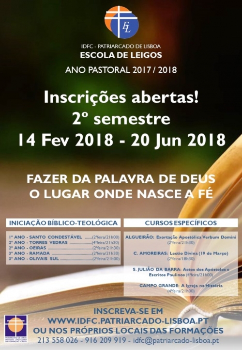 A Escola de Leigos do Patriarcado de Lisboa vai iniciar, no próximo dia 14 de fevereiro, o 2º semestre da Iniciação Bíblico-Teológica, que se prolonga até dia 20 de junho.
