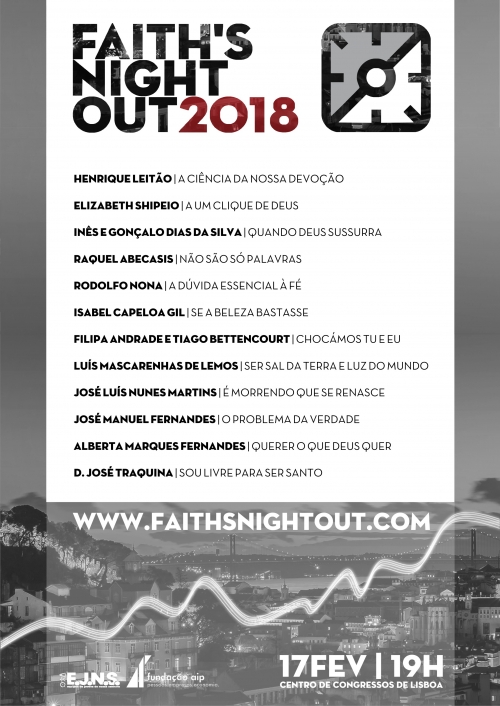 A quarta edição do evento “Faith’s Night Out” (FNO) vai decorrer no próximo dia 17 de fevereiro, às 19h00, no Centro de Congressos de Lisboa (antiga FIL). Tal como nas edições anteriores, os 12 convidados contam com apenas 7 minutos para falarem sobre um tema. O evento é organizado pelas Equipas de Jovens de Nossa Senhora e “pretende inspirar os participantes a viverem mais intensa e comprometidamente a sua vida de fé”. “Com conferências simples e diretas, e partindo do conhecimento e do exemplo de vida de quem fala, o FNO quer trazer a fé para o centro desta noite”, lê-se num comunicado enviado pela organização.