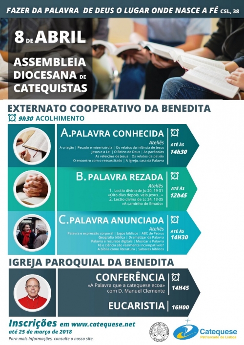 Subordinada ao tema ‘Fazer da Palavra de Deus o lugar onde nasce a Fé’, a Assembleia Diocesana de Catequistas terá, durante a parte da manhã, “vários ateliês que possibilitarão conhecer a Palavra, rezar a Palavra ou contactar com diversos modos de anunciar a Palavra”, informa o Setor da Catequese da diocese, que organiza o encontro que se inicia pelas 9h45, com o acolhimento, no Externato Cooperativo da Benedita. A assembleia conta ainda, às 14h45, com uma conferência de D. Manuel Clemente, sobre ‘A Palavra que a catequese ecoa’, que vai ter lugar na igreja paroquial da Benedita, tal como a Eucaristia de encerramento, a partir das 16h00.