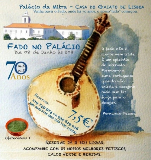 A Casa do Gaiato de Lisboa celebra 70 anos (1948-2018) e organizou uma noite de fados que vai decorrer no próximo dia 8 de junho, sexta-feira, no Palácio da Mitra, em Santo Antão do Tojal, Loures. A iniciativa ‘Fado no Palácio’ vai decorrer ao ar livre e tem um custo de 7,5¤, com a oferta de um caldo verde. A organização convida os interessados a fazer a sua reserva pelo número de telefone 219749974 (lugares limitados).