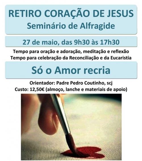 O Seminário Nossa Senhora de Fátima, em Alfragide, está a organizar, para o próximo dia 27 de maio, Domingo, das 9h30 às 17h30, um Retiro do Coração de Jesus, com o tema ‘Só o amor recria’, orientado pelo padre Pedro Coutinho, sacerdote dehoniano. Será um “tempo para oração e adoração, meditação e reflexão”, mas também um “tempo para celebração da Reconciliação e da Eucaristia”, informa a organização. As inscrições têm um custo de 12,5¤ e podem ser feitas através dos contactos do seminário.