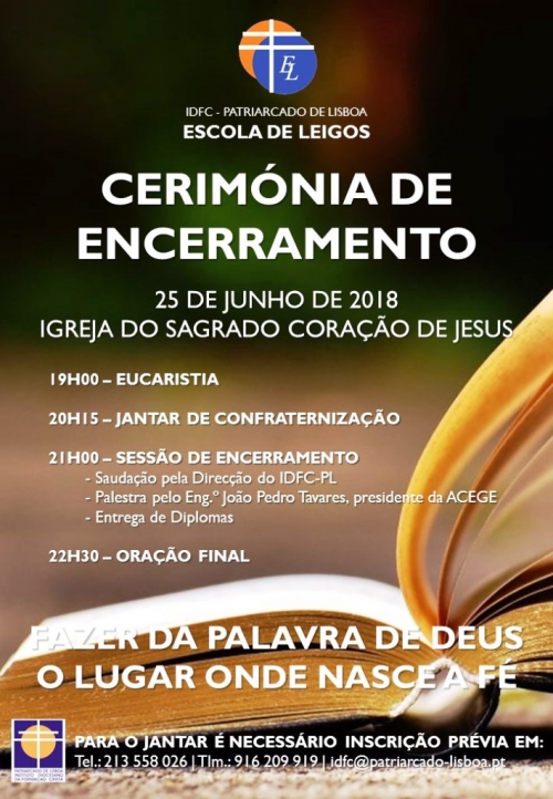 O presidente da ACEGE (Associação Cristã de Empresários e Gestores), João Pedro Tavares, é o convidado especial do encerramento anual da Escola de Leigos, instância formativa do Instituto Diocesano da Formação Cristã (IDFC), do Patriarcado de Lisboa. O encontro vai ter lugar no dia 25 de junho, segunda-feira, na Igreja do Sagrado Coração de Jesus, em Lisboa, e tem início com a Missa, às 19h00, o jantar e a sessão de encerramento, com a palestra, seguindo-se a distribuição dos diplomas aos finalistas do Triénio Bíblico-Teológico (Olivais Sul e Ramada).