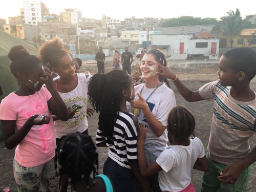 O projeto Cabo Verde é “organizado a nível nacional e desenvolvido por estudantes universitárias e jovens profissionais.” Em 2017 integrou o grupo de 60 voluntárias que partiu para o Bairro do Fonton na Ilha de Santiago em Cabo Verde e partilha: “Durante duas semanas realizamos vários tipos de atividades com a população, desde atividades com as crianças e jovens, promoção do ambiente, cursos de culinária, empreendedorismo, informática, um curso de primeiros socorros e montamos ainda um dispensário médico. Eu em particular estive envolvida nas atividades do dispensário e nas atividades das crianças, em que coordenei os jogos das crianças mais novas, entre os 5 e os 8 anos. O dia-a-dia no bairro era sempre uma animação, eramos diariamente recebidas com o sorriso e os abraços das crianças que vinham a correr na nossa direção sempre que entrávamos no bairro. A manhã era passada entre artes, teatro, volta ao mundo, coro, hora do conto e jogos. Estar com as crianças foi das coisas que mais me marcou no projeto. A alegria com que elas vivem, o entusiamo que tinham só por um bocadinho de colo ou atenção. São incontáveis a quantidade de beijinhos, abraços e “colinho” que dei e recebi daqueles meninos. Só um bocadinho de atenção parecia que lhes mudava o dia, punha um brilho nos olhos inexplicável! Crianças que tinham pouco, mas que o pouco que tinham era para dar. Eram de uma autenticidade e generosidade inigualável! É impossível esquecer o nome daquelas crianças com quem estava quase todos os dias e às quais ganhei um carinho enorme. Foram imensos os rostos e nomes que para mim marcaram este projeto e que vão ficar sempre guardados na minha memória e no meu coração. Para além das crianças, também estive envolvida no dispensário médico, onde quatro médicas estavam a dar consultas à população. Tive a oportunidade de as auxiliar no que era necessário, fazendo um bocadinho de triagem, ajudando nas consultas e atendendo uma pessoa ou outra - sempre com as médicas como pano de fundo. Consultar os adultos também foi muito enriquecedor. Na área da saúde, dei ainda uma formação acerca do dengue e da malária, e participei noutra de suporte básico de vida. Notava-se que aquelas pessoas estavam ali para aprender e queriam levar consigo o máximo de conhecimento que lhes conseguíssemos transmitir. Também pude participar em algumas das atividades dirigidas às jovens, e foi edificador ver o empenho delas a aprender, sempre muito atentas, a absorver tudo o que tínhamos para lhes ensinar. Foi muito difícil ouvir todos os “porque é que vais embora?”, “quando é que voltas?”, “eu quero ir contigo”, principalmente porque não tinha resposta para nenhuma daquelas questões. A verdade é que eu não queria vir embora, queria voltar no dia seguinte e, se fosse para vir, queria que eles viessem todos comigo. Foi duro voltar à realidade do nosso país, onde tudo é sobrevalorizado, onde entramos num centro comercial e compramos peças que nunca vamos usar, desperdiçamos comida, tomamos a água e a luz como garantidas e não temos metade da felicidade daquelas pessoas. Este projeto ajudou-me, entre muitas outras coisas – sim, porque por mais que tente nunca vou conseguir pôr em palavras tudo o que vivi lá e tudo o que significou para mim – a ver o que é supérfluo, a “desdramatizar” e a dar valor ao que realmente tem valor. E deixou-me ainda uma certeza - eu queria voltar, “calçar as sapatilhas, deixar o sofá” e voltar a ajudar! Este ano vou voltar ao Fonton com o projeto cabo verde 2018 e mal posso esperar por voltar a ver aqueles sorrisos e ajudar aquelas pessoas!”