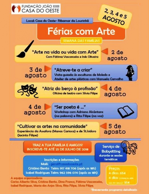 A Fundação João XXIII – Casa do Oeste vai promover uma Semana das Famílias, com o tema ‘Férias com Arte’, que vai decorrer de 2 a 5 de agosto, em Ribamar da Lourinhã. Do programa constam momentos de formação, interiorização, celebração e convívio, como uma visita a Moledo. Para os mais pequenos, há serviço de babysitting e atividades adequadas. ‘Arte na vida ou vida com arte’, ‘Atriz do berço à profissão’ ou ‘Cultivar as artes na comunidade’ são alguns dos subtemas das formações, onde consta também um atelier de artes plásticas e serões temáticos.