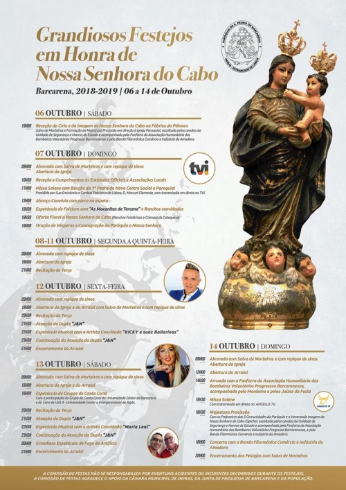 Os ‘Grandiosos Festejos em Honra de Nossa Senhora do Cabo’, como a paróquia apelida, vão ter lugar de 6 a 14 de outubro. No primeiro dia, a receção do Círio Saloio vai ser feita na Fábrica da Pólvora, a partir das 19h00, a que se segue a “majestosa procissão” em direção à igreja paroquial. No dia seguinte, a 7 de outubro, Domingo, às 11h00, o Cardeal-Patriarca de Lisboa, D. Manuel Clemente, preside à Missa solene, com bênção da primeira pedra do novo centro social e paroquial.