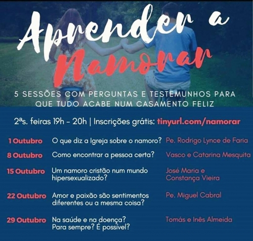 ‘Aprender a namorar’ é o tema de um curso sobre namoro cristão que vai decorrer no Oratório São Josemaria, em Lisboa, nas segundas-feiras de outubro, das 19h00 às 20h00. A primeira sessão, sobre ‘O que diz a Igreja sobre o namoro?’, tem como orador o padre Rodrigo Lynce de Faria, a que se segue ‘Como encontrar a pessoa certa’ (Vasco e Catarina Mesquita), ‘Um namoro cristão num mundo hipersexualizado’ (José Maria e Constança Vieira) e ‘Amor e paixão são sentimentos ou a mesma coisa? (padre Miguel Cabral). Esta formação termina com Tomás e Inês Almeida a questionarem ‘Na saúde e na doença? Para sempre? É possível?’.