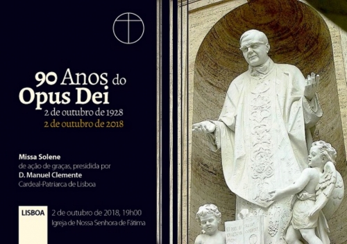 O Cardeal-Patriarca de Lisboa, D. Manuel Clemente, vai presidir à Missa solene comemorativa dos 90 anos do Opus Dei. A celebração vai ter lugar a 2 de outubro, terça-feira, às 19h00, na Igreja de Nossa Senhora de Fátima, em Lisboa. A 6 de outubro, às 12h30, na Basílica da Santíssima Trindade, em Fátima, o vigário regional do Opus Dei em Portugal, monsenhor José Rafael Espírito Santo, preside também à Eucaristia comemorativa.