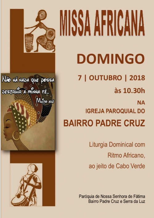 A Paróquia de Nossa Senhora de Fátima do Bairro Padre Cruz, em Lisboa, está a organizar, para este Domingo, dia 7 de outubro, a celebração de uma Missa Africana. A partir das 10h30, na igreja paroquial, “a liturgia dominical vai ter ritmo africano, ao jeito de Cabo Verde”, informa a paróquia. Esta é uma iniciativa que vai decorrer no maior bairro municipal da Península Ibérica e que visa a construção de comunidade. “Celebrando a fé, acolhendo irmãos e integrando em comunidade”, frisa a nota.