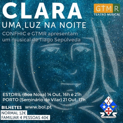 A Congregação das Irmãs Franciscanas Hospitaleiras da Imaculada Conceição (CONFHIC) e o GTMR - Grupo de Teatro Musical Religioso, que nasceu em 2013, na Parede, Cascais, apresentam o musical ‘Clara – uma luz na noite’, que vai estar em cena no dia 14 de outubro, Domingo, em duas sessões (16h e 21h), no auditório da Boa Nova, no Estoril.