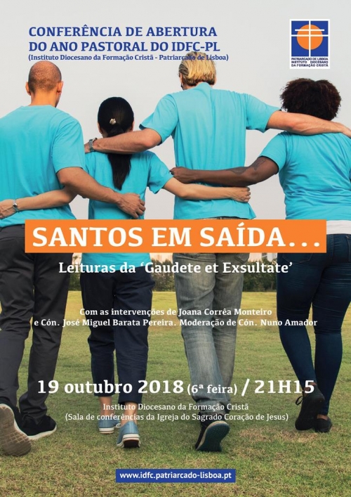 A conferência de abertura do ano pastoral no Instituto Diocesano da Formação Cristã (IDFC), do Patriarcado de Lisboa, tem como tema ‘Santos em saída…’ e vai decorrer no próximo dia 19 de outubro, sexta-feira, às 21h15, na sala de conferências da Igreja do Sagrado Coração de Jesus, em Lisboa. Esta iniciativa, com leituras da Exortação Apostólica do Papa Francisco ‘Gaudete et exsultate’, sobre a chamada à santidade no mundo atual, conta com intervenções de Joana Corrêa Monteiro, professora e investigadora, e do cónego José Miguel Pereira, reitor do Seminário dos Olivais, sendo moderada pelo cónego Nuno Amador.