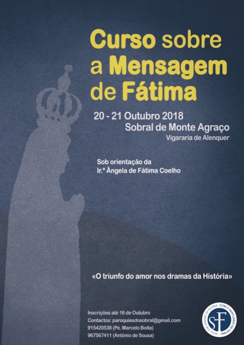 A irmã Ângela Coelho, religiosa da Aliança de Santa Maria que é vice-postuladora da causa de beatificação da Irmã Lúcia e foi postuladora da causa de canonização de Francisco e Jacinta Marto, orienta um Curso sobre a Mensagem de Fátima que vai decorrer no salão dos Bombeiros Voluntários de Sobral de Monte Agraço. Organizada pela Vigararia de Alenquer, esta formação decorre dias 20 e 21 de outubro e tem como tema ‘O triunfo do amor nos dramas da História’. O curso, com inscrições abertas até dia 16, é organizado em parceria com o Santuário de Fátima.