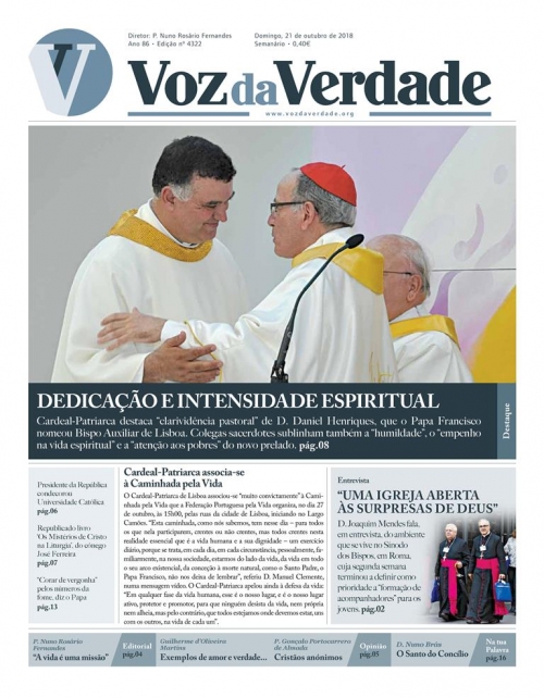 Na mensagem que escreveu a propósito da nomeação do novo Bispo Auxiliar, D. Manuel Clemente refere que “D. Daniel soma-se aos vários membros do Presbitério de Lisboa que na última década têm sido chamados ao Episcopado, em benefício de várias Dioceses”. Será, certamente, motivo de alegria para a nossa diocese este dom à Igreja, mas também, cada vez mais, responsabilidade de todos nós, padres, na procura de uma vida de santidade para servir com fidelidade, comunhão e lealdade a Igreja que confirmou a nossa vocação. Por outro lado, é, também, motivo de responsabilidade das famílias e comunidades paroquiais serem capazes de dar à Igreja vocações consagradas, missionárias e ao sacerdócio, porque estas não se fabricam por encomenda, mas nascem nas comunidades cristãs e nas famílias. Assinalando que este Domingo é dedicado às missões, não nos esqueçamos que, como refere o Papa Francisco na sua mensagem para este dia, “a vida é uma missão”.