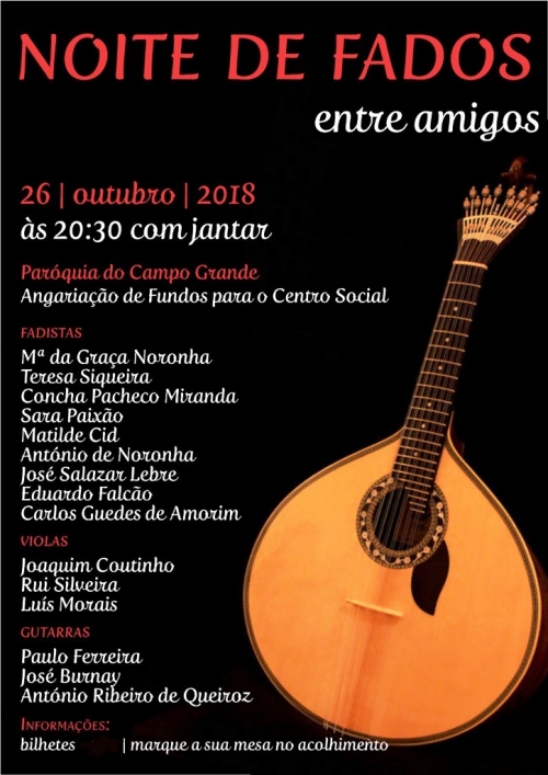 A Paróquia do Campo Grande, em Lisboa, está a organizar uma ‘Noite de fados entre amigos’, com uma componente solidária: a angariação de fundos para o centro social. Esta iniciativa vai decorrer na próxima sexta-feira, dia 26 de outubro, às 20h30, e inclui jantar. Entre os fadistas, contam-se as atuações de Maria da Graça Noronha, Teresa Siqueira, Concha Pacheco Miranda, Sara Paixão, Matilde Cid, António de Noronha, José Salazar Lebre, Eduardo Falcão e Carlos Guedes de Amorim.