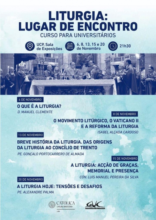 A Capelania Universitária da Universidade Católica Portuguesa (UCP) e o CeUC - Pastoral Universitária de Lisboa estão a organizar um curso para universitários sobre liturgia. Esta formação, que decorre na sala de exposições da UCP, em Lisboa, sempre às 21h30, tem como tema geral ‘Liturgia: lugar de encontro’ e teve início no dia 6 de novembro e prosseguiu dois dias depois. As próximas sessões vão ter lugar nos dias 13 de novembro, com o padre Gonçalo Portocarrero de Almada, e 15 de novembro, pelo cónego Luís Manuel. A iniciativa termina dia 20, com o padre Alexandre Palma a falar sobre ‘A liturgia hoje: tensões e desafios’.