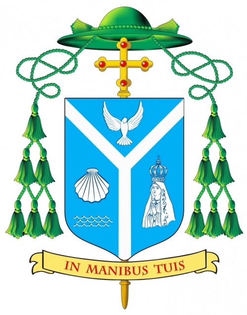 Chapéu com dois cordões e seis borlas, tudo em verde. Cruz pastoral dourada sotoposta ao escudo e ao listel. Escudo azul-celeste dividido em três campos por cruz em prata. No campo superior, a pomba em prata; no campo à direita, uma vieira sobre três linhas onduladas, tudo em prata; no campo à esquerda, busto de Nossa Senhora de Fátima, em prata. Na base do escudo, listel dourado que ostenta o lema “IN MANIBUS TUIS”, a vermelho, cor do martírio, em referência a Santo Adrião, mártir.