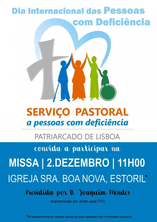 Por ocasião do Dia Internacional da Pessoa com Deficiência, que se comemora anualmente a 3 de dezembro, o Serviço Pastoral a Pessoas com Deficiência do Patriarcado de Lisboa convida “todos a participar na Eucaristia celebrativa do dom e da riqueza da pessoa com deficiência na Igreja e no mundo”, que vai ter lugar no próximo Domingo, 2 de dezembro pelas 11h00, na Igreja da Senhora Boa Nova no Estoril, presidida por D. Joaquim Mendes, Bispo Auxiliar de Lisboa.