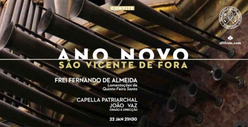 O Patriarcado de Lisboa e a Editora Althum promovem um Concerto de Ano Novo, no dia 22 de janeiro, terça-feira, às 21h30, na Igreja de São Vicente de Fora, em Lisboa, com a Capella Patriarchal a interpretar ‘Frei Fernando de Almeida - Lamentações de Quinta-Feira Santa’. “Frei Fernando de Almeida (c.1620-1660) é um dos últimos representantes da tradição de polifonistas portugueses que antecedeu o período de italianização da música sacra”, refere um comunicado, acerca do concerto que vai ter João Vaz ao órgão e na direção.