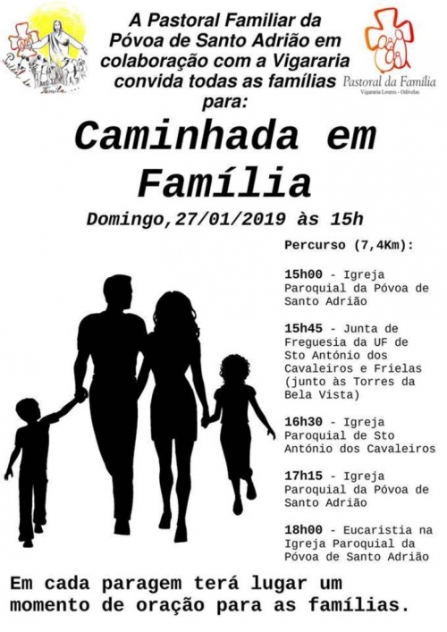 A Pastoral Familiar da Paróquia da Póvoa de Santo Adrião, em conjunto com a Vigararia de Loures-Odivelas, está a organizar uma ‘Caminhada em Família’, iniciativa que consiste numa pequena caminhada de 7,4 quilómetros, com alguns momentos de oração/reflexão sobre a família. Esta atividade, dirigida a todas as famílias, vai decorrer na tarde do próximo Domingo, 27 de janeiro, começando na igreja paroquial da Póvoa, às 15h00, seguido para a junta de freguesia de Santo António (Torres da Bela Vista), depois até à Igreja de Santo António, regressando à igreja da Póvoa, onde conclui com a Eucaristia das 18h00.