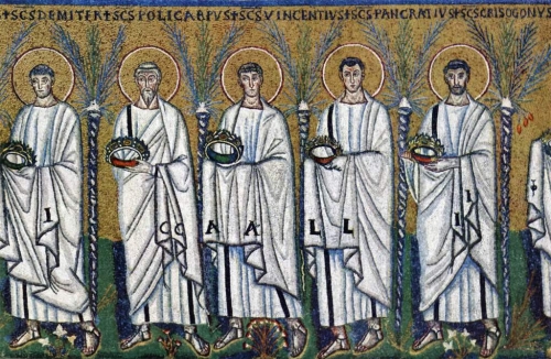 Foto: Fileira de mártires - Pormenor do mosaico da nave central da Basílica de Santo Apolinário o Novo, Ravena, Itália (séc. VI)