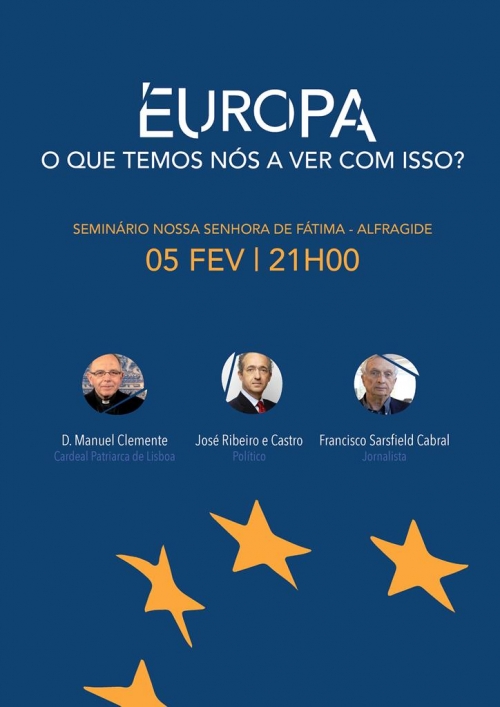 ‘Europa: O que é que nós temos a ver com isso?’ é o tema de uma conferência que vai juntar, no dia 5 de fevereiro, terça-feira, às 21h00, no Seminário Nossa Senhora de Fátima, em Alfragide, o Cardeal-Patriarca de Lisboa, D. Manuel Clemente, o antigo presidente do CDS-PP e antigo Eurodeputado, José Ribeiro e Castro, e o jornalista Francisco Sarsfield Cabral, especialista em assuntos económicos e políticos. “Em ano missionário, em vésperas das eleições europeias, queremos propor, a todos os homens e mulheres de boa vontade, uma noite de reflexão acerca dos desafios que o nosso continente enfrenta e o lugar que nós, católicos, podemos ter na resolução daqueles problemas que afetam a Pessoa”, refere um comunicado dos Sacerdotes do Coração de Jesus (Dehonianos), que organizam o encontro, de entrada livre.
