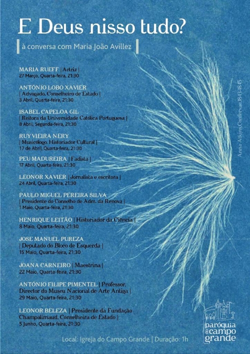 A Paróquia do Campo Grande iniciou uma série de conversas com um convidado. “Ao longo de 11 semanas, Maria João Avillez, jornalista e nossa paroquiana, convida uma figura da sociedade civil para uma conversa cujo ponto de partida é ‘E Deus nisso tudo?’. Da política à saúde, passando pela música e ciência, serão certamente momentos a não perder com António Lobo Xavier, Isabel Capeloa Gil, Ruy Vieira Nery, Peu Madureira, Leonor Xavier, Paulo Pereira Silva, Henrique Leitão, José Manuel Pureza, Joana Carneiro, António Filipe Pimentel e Leonor Beleza”, refere uma nota.