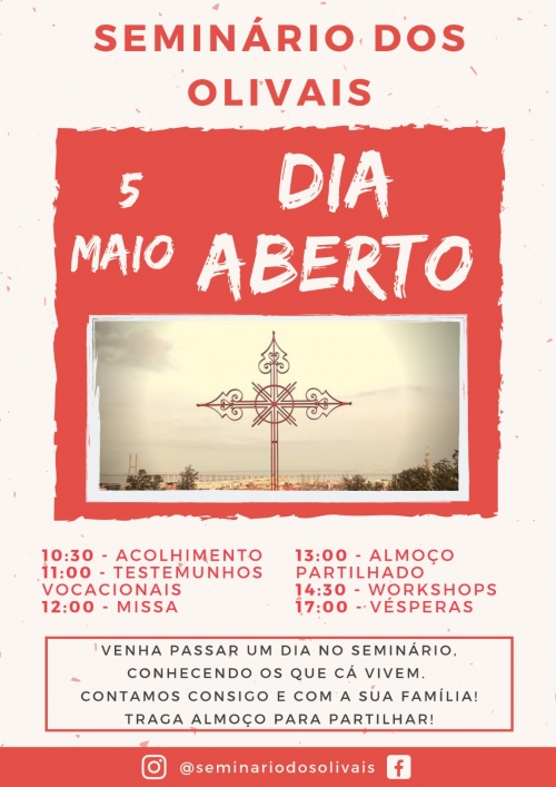 Para dar início à Semana das Vocações, o Seminário dos Olivais vai abrir as suas portas a todos. “O Seminário alegra-se por receber a visita de quem quiser vir passar o dia 5 de maio connosco, entre as 10h30 e as 17h30, para assim iniciarmos a Semana das Vocações. Sendo o dia da Mãe, o convite é também para que venham passar o dia em família, cuidando do coração da Diocese que é o Seminário e, com jogos, convívio e partilha, vivermos juntos a alegria de fazer de cada comunidade um seio onde nascem e crescem as vocações cristãs felizes e generosas. Traga almoço para partilhar por favor! No Seminário dos Olivais, esperamos por todos vós!”, convida o reitor do seminário, cónego José Miguel Pereira.