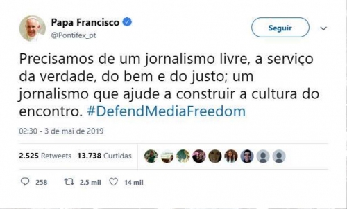 4. Por ocasião do Dia Mundial da Liberdade de Imprensa, assinalado no dia 3 de maio, o Papa apelou a um jornalismo livre. “Precisamos de um jornalismo que seja livre, ao serviço da verdade, da justiça e da bondade; um jornalismo que ajude a construir uma cultura de encontro”, escreveu Francisco, na rede social Twitter.